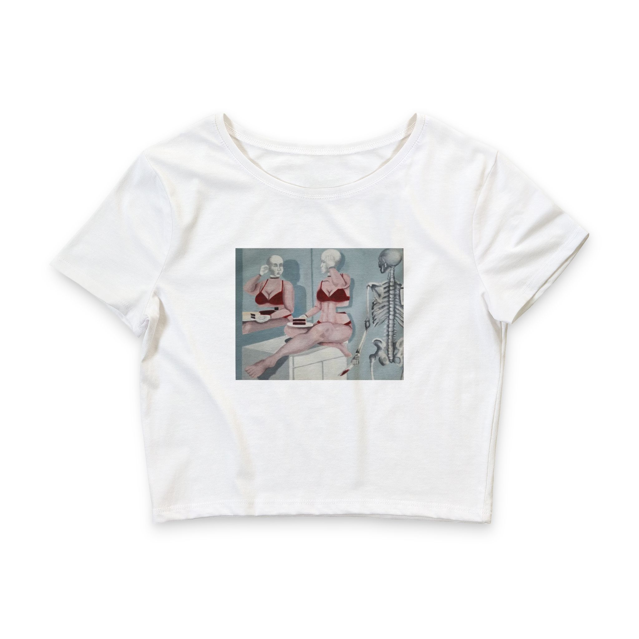 This crop tee graphic includes original painting “A Slice of Red Velvet Waist.” Featured in the student surrealist exhibit in 2021 at The Dali Musuem in St. Petersburg, Florida.